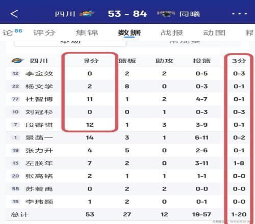 赛后的技术统计,真的不忍卒读。四川队全场总共得53分,去掉罚球的14分,实际上动动战只得了39分。全队除了景菡一和段睿骐得分上双,首发李金效0分,刘冠杉0分,杨文学2分。全队总共只有12次助攻,篮板球输了同曦几20个,失误14次。更令人尴尬的是,全队有8名球员在三分线上出手20次,仅命中一球,命中率为5%。