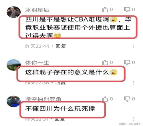“真就不能考虑考虑升降级吗?宁波都改头换面了,四川和江苏还是这死样。”;“职业球员20中1,是怎么做到的?”;“十分钟比赛拿八分,就这是国内球员的水平。”;“四川队是不是想让CBA难堪啊,毕竟职业联赛随便用个外援也算面上过得去啊!”;“这群混子存在的意义是什么”;“这群混子存在的意义是什么?”……