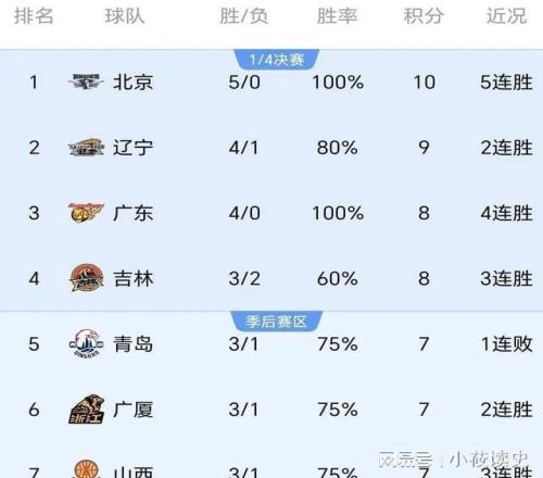 CBA积分榜:北京、广东皆6连胜+天津首胜,山东、浙江排名靠后