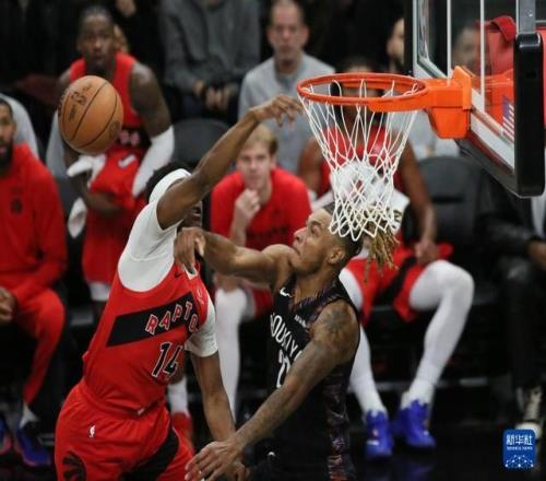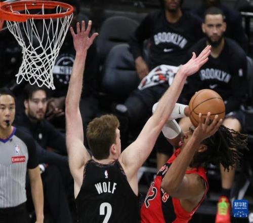 12月21日,篮网队球员奎克利(右)在比赛中封盖猛龙队球员沃尔特。新华社记者 张凤国 摄