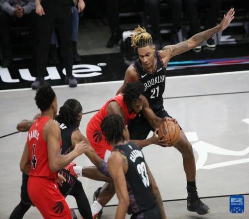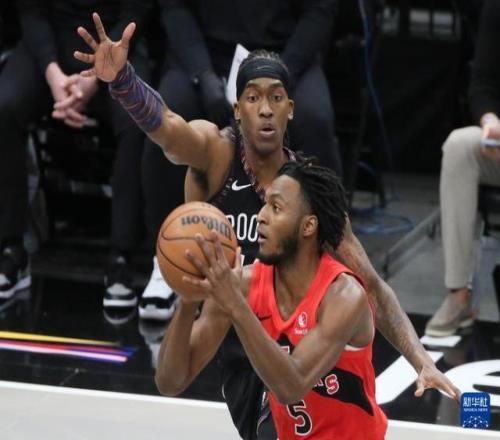 12月21日,篮网队球员杰明(前)在猛龙队球员马穆克拉什维利(右)的防守下投篮。新华社记者 张凤国 摄