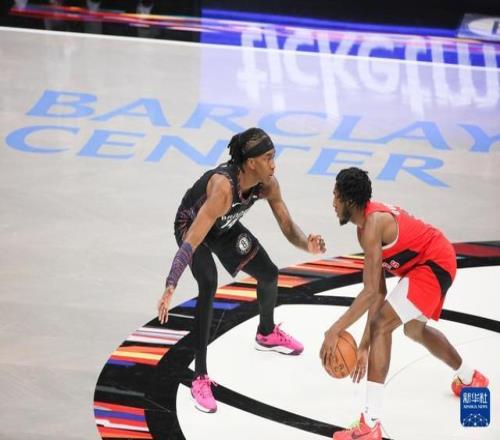 12月21日,篮网队球员特伦斯·曼恩(左)在比赛中防守猛龙队球员奎克利。新华社记者 张凤国 摄