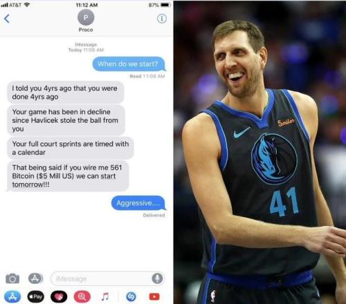 北京时间今日,美媒NBA Memes晒出了一张独行侠传奇球星德克-诺维茨基与其训练时的聊天记录,记录中两人就诺维茨基的训练内容进行了交流。