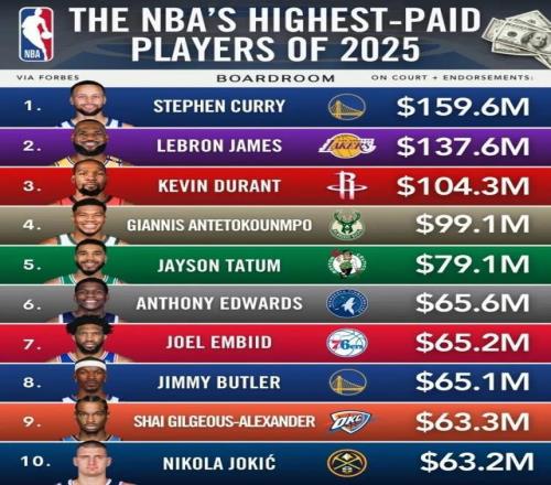 福布斯2025年NBA球员收入排名,库里力压詹姆斯排名第一位,杜兰特第三