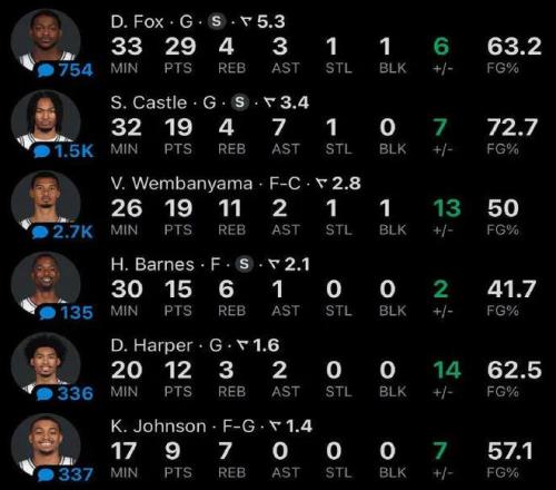 福克斯高效轰下29分4篮板3助攻(19中12,3分4中4),最佳新秀卡斯尔同样高效砍下19分7助攻(11中8),哈珀替补8中5拿下12分3板2助,既雪中送炭又锦上添花。