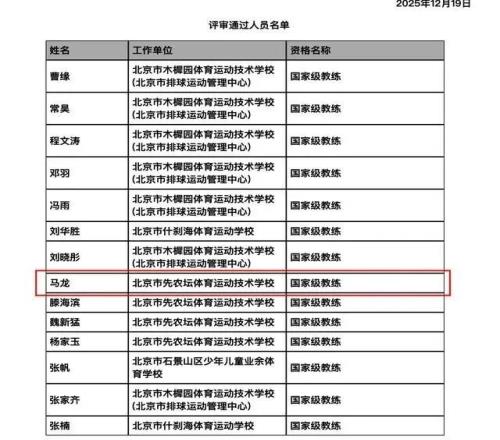 据北京市人社局网站消息,近日,北京市高级专业技术资格评审委员会发布公示,曹缘等14人通过了国家级教练专业技术资格评审。其中,乒乓球运动员马龙在列,获得国家级教练资格。