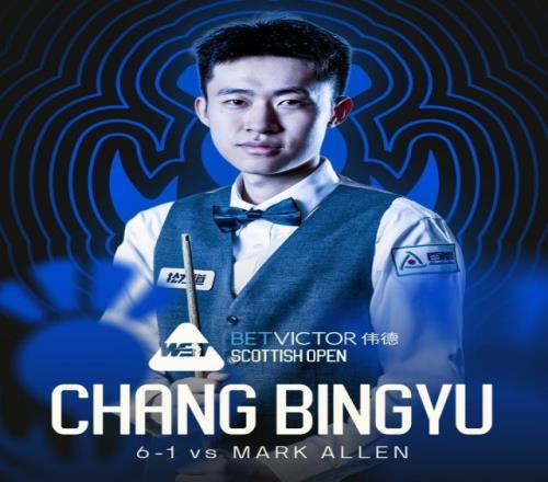 2025斯诺克苏格兰公开赛半决赛,常冰玉6比1战胜马克·艾伦晋级决赛。全场比赛常冰玉打出两杆破百(134、108)和三杆50+(67、68、57),上半场结束常冰玉3比1领先马克·艾伦,中场休息后,常冰玉连胜三局,最终6比1战胜马克·艾伦晋级决赛。
