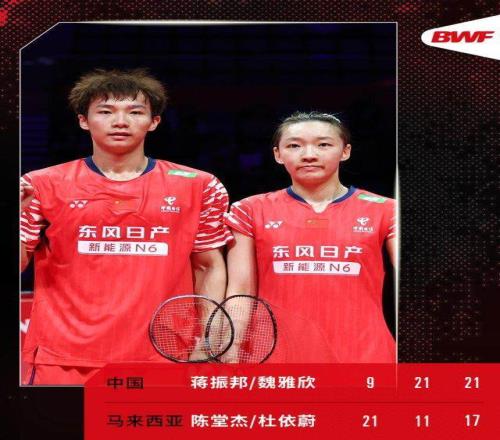 北京时间12月20日,在2025年世界羽联年终总决赛混双半决赛中,中国组合蒋振邦/魏雅欣在面对马来西亚组合陈堂杰/杜依蔚,在9比21先丢一盘的情况下,以21比11和21比17,大比分2比1逆转取胜,晋级决赛。他们的决赛对手将是另一对中国组合冯彦哲/黄东萍,国羽也提前包揽总决赛混双冠亚军。