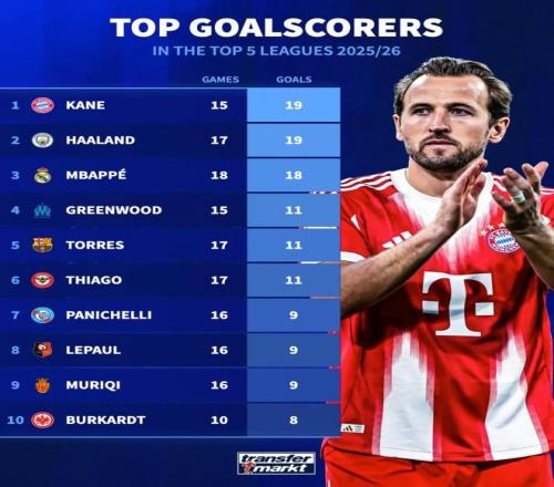 本赛季五大联赛射手榜:凯恩、哈兰德19球第1,姆巴佩18球